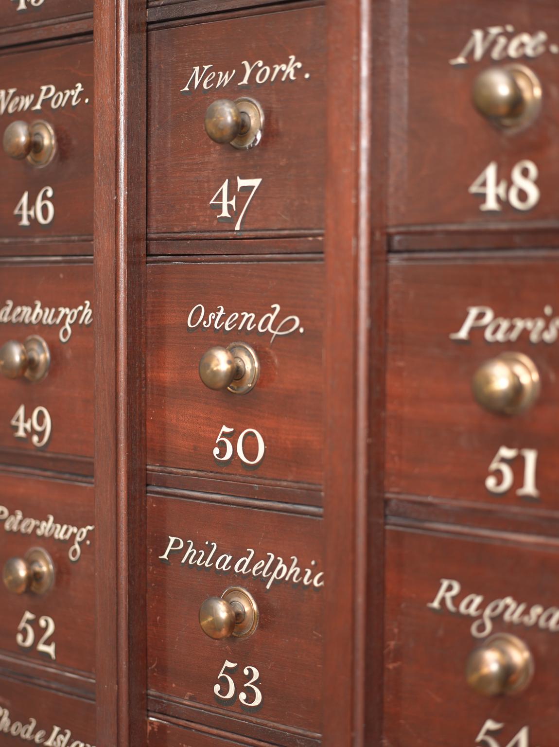 36-drawer wooden cabinet, with drawers numbered 37 to 72, from the Viscount Castlereagh Collection of weights, unsigned, 1815-1818