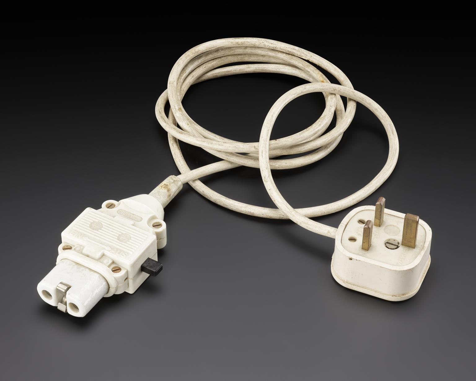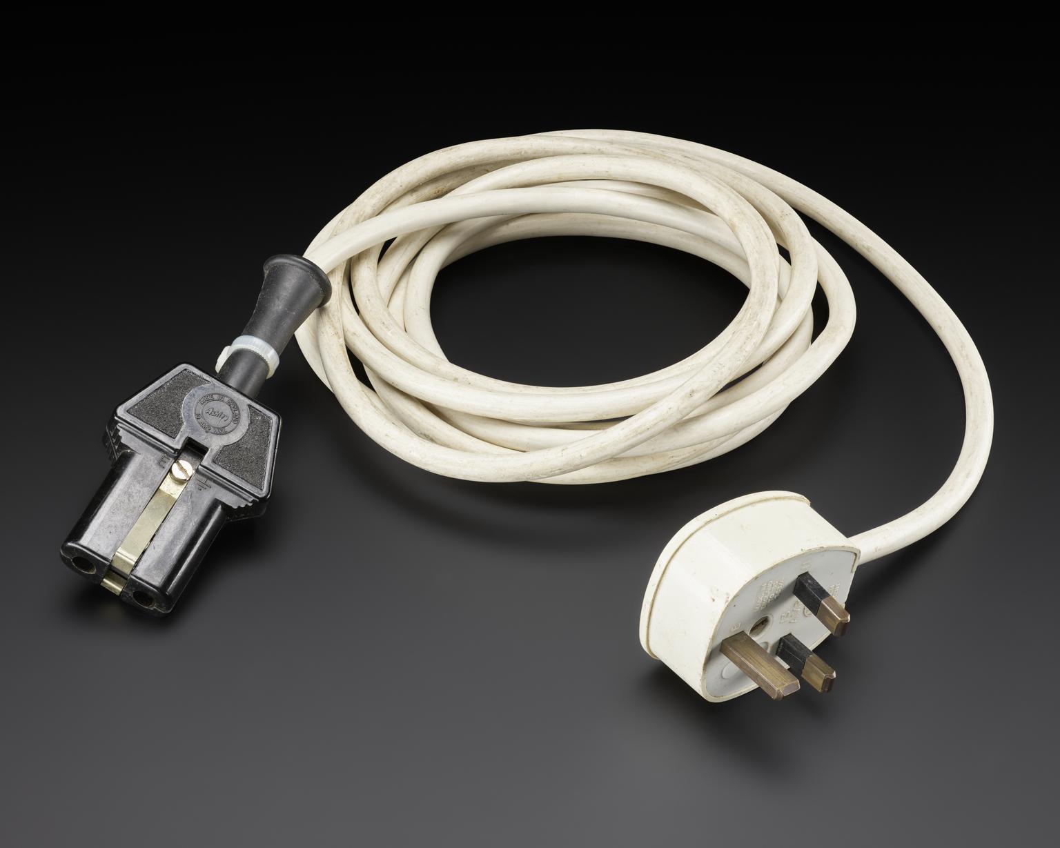 White cable with black attachment made in England by Ashely, labelled 'Hospital Property' for mechanical real-time scanner ‘Vidoson 635’, Siemens, Germany 1965.