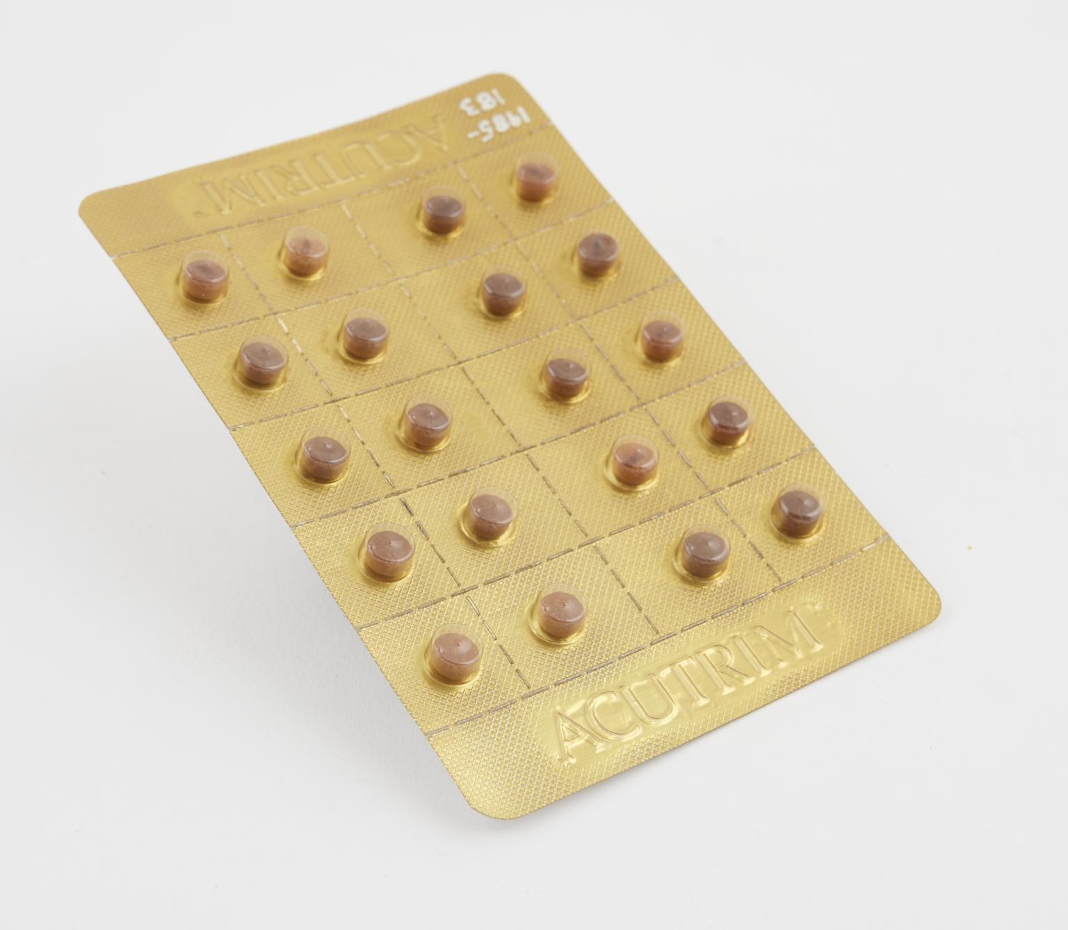 A blister pack of 20 Acutrim appetite suppressants tablets, made by Alza Corporation for 16 hour precision release, 1984