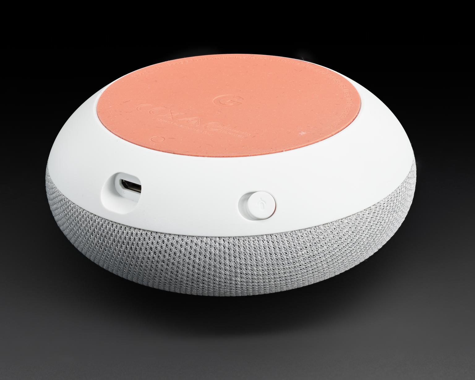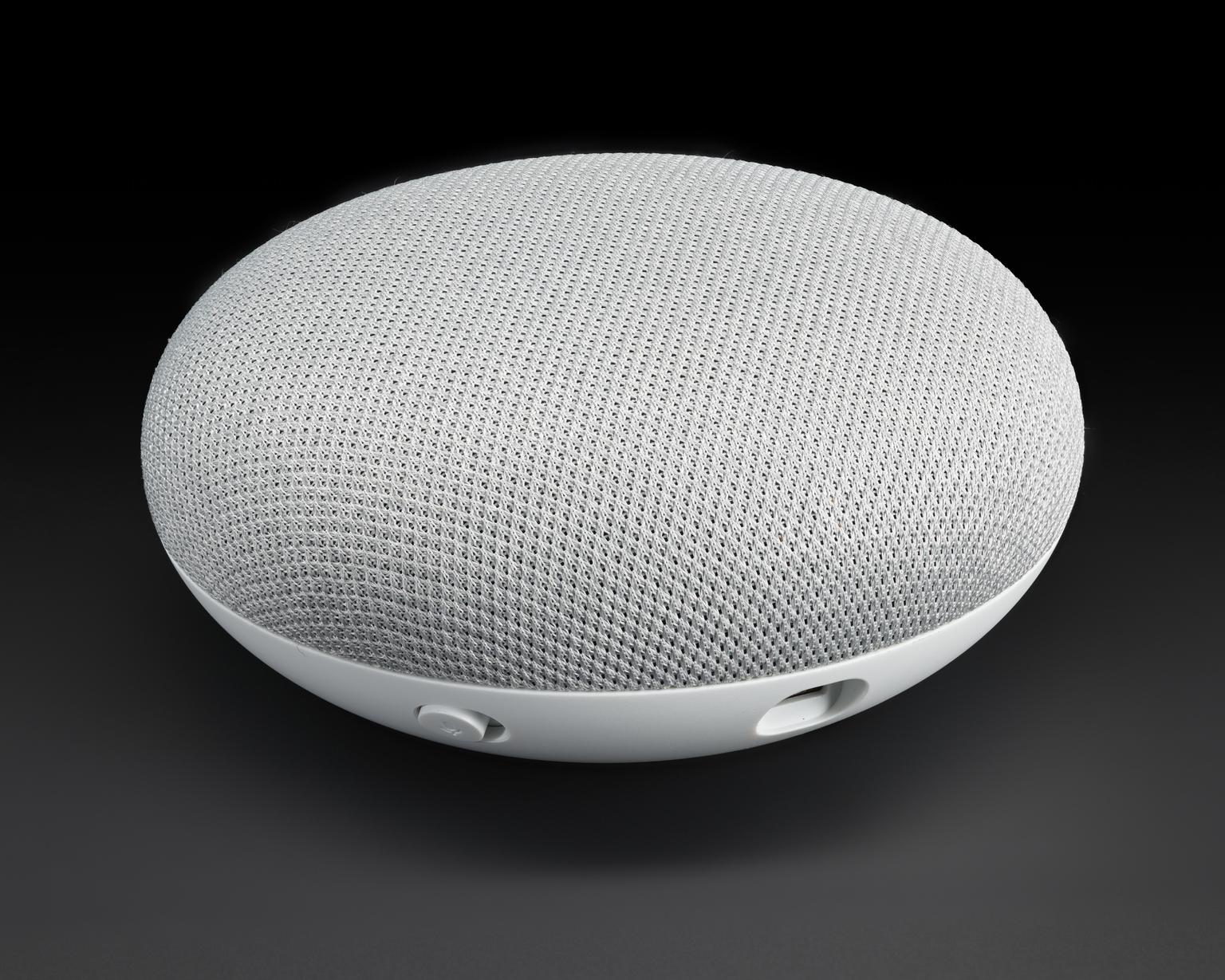 The Google Home Mini speaker was manufactured by Google and released in 2017. The Bluetooth smart speaker includes Google Assistant, Google's AI powered virtual assistant. This allows for users to interact with the speaker using voice recognition for tasks such as playing music and answering questions. The speaker was compatible with other Google smart home products and allowed users to control things such as smart lights and thermostats using the speaker. Google partnered with Spotify to run a promotion upon release where Spotify Premium subscribers could get a Google Home Mini for free. This promotion flooded the market with the product and allowed Google to gain back some market share from Amazon, who had released their own series of smart speakers several years earlier. The speaker was partly manufactured from recycled plastic bottles.