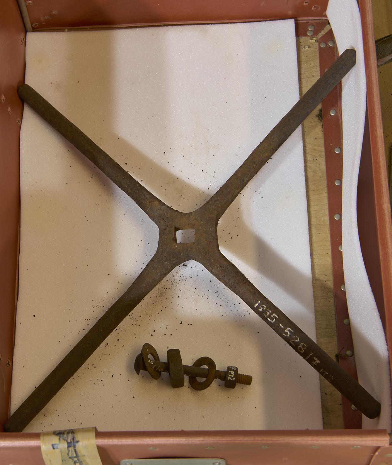 Draw bench, winch handle, wire drawing tongs and shakle, and parts from a pianoforte. Given by Mr James Greig.