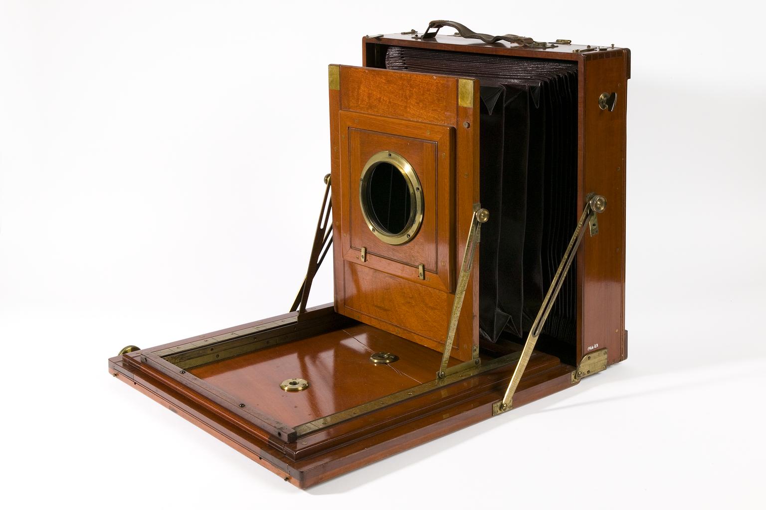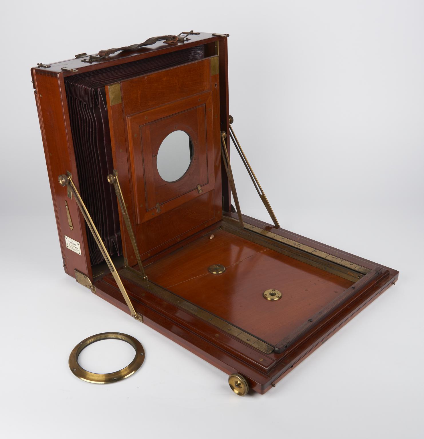 'British' 15x 12 inch plate camera made by J.T Chapman Ltd of Manchester, c1888. No lens but a lens ring. Rectangular box with hinged, ground lass plate (broken) at rear. Hinged wooden front drops down to form baseboard. Double extension . Rising front. Detachable lens panel. Front tilts forward. Back tilts forward and (by changing position of screw in angled side plate) back. Tapered ‘square’ maroon bellows.