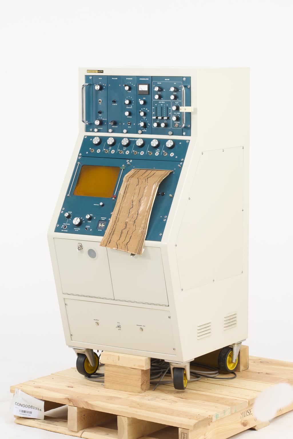 Echocardiography is a bedside technique for examining the heart. In this machine, high frequency ultrasound waves are produced by a transducer placed on the patient’s chest. The waves rebound or echo off the beating heart. These show the shape, size and movement of a heart's chambers and valves. They also show the rate of blood flow through the heart. Physicians examine these records for irregularities that may be a sign of disease. This echocardiograph was made by Cambridge Medical Instruments Limited in England.