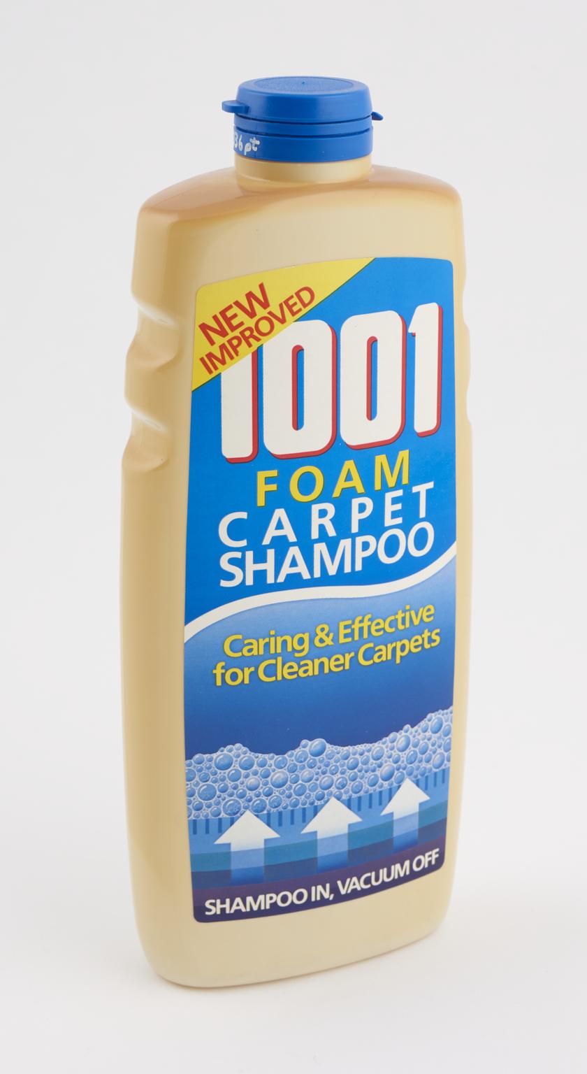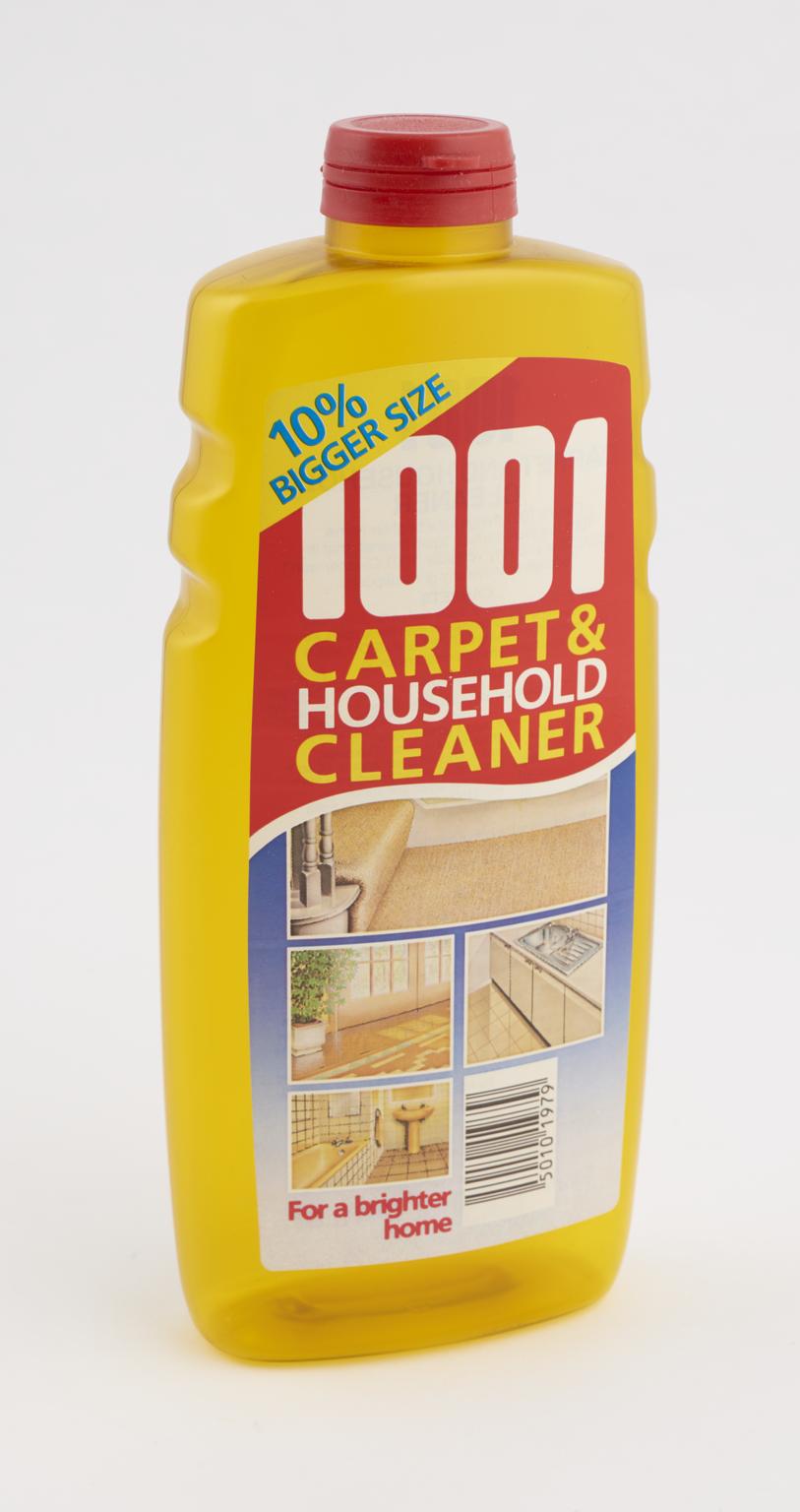 Bottle of "1001 carpet & household cleaner", yellow bottle, with red polythene "Jaycap" lid, manufactured by Metal Box, 1985.