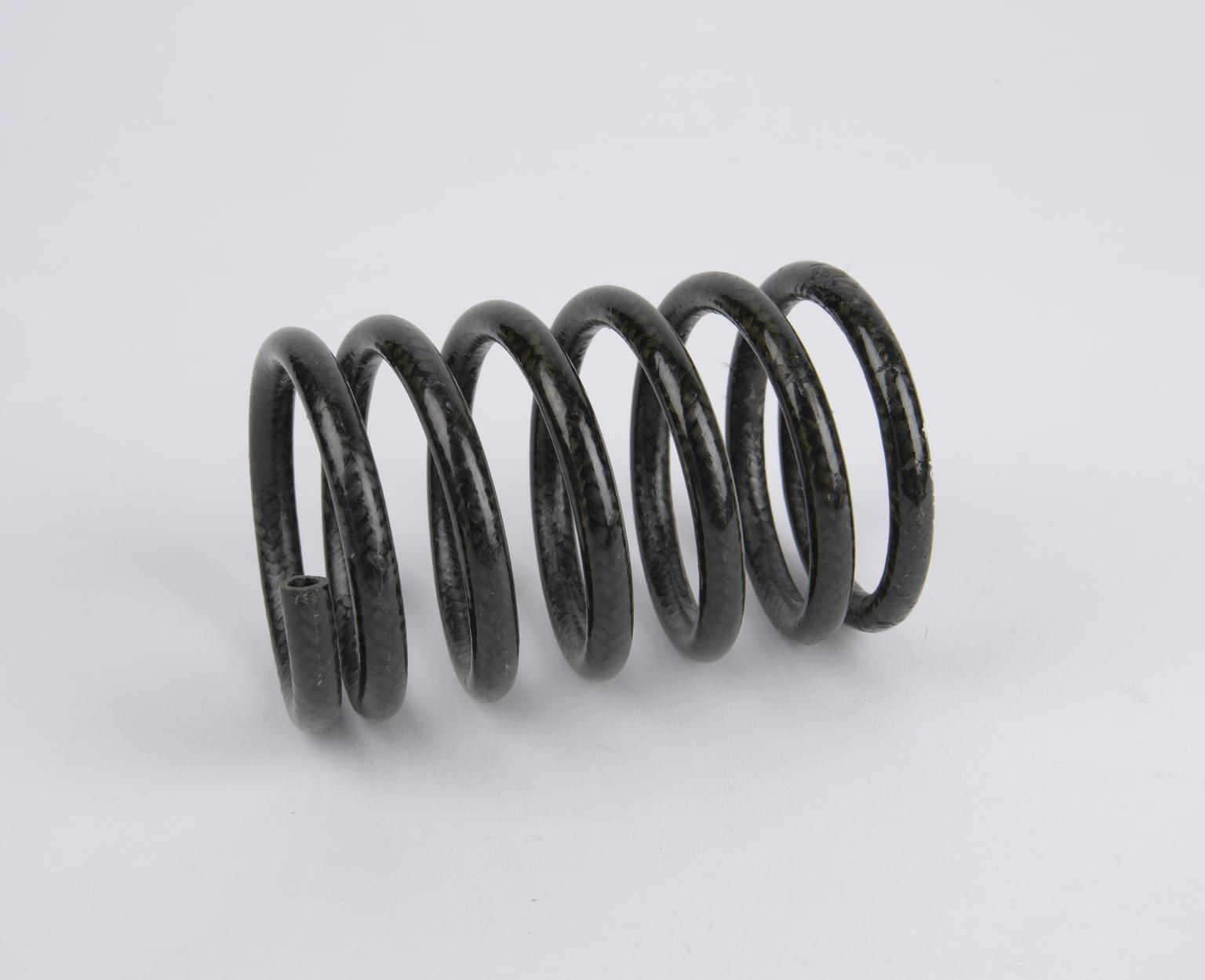 Fibre reinforced plastic car components: a) Fibre reinforced wheel; b) Suspension arm in fibre reinforced polyester; c) Two coil springs in fibre reinforced plastic; d) Sulcated spring in fibre reinforced polyester