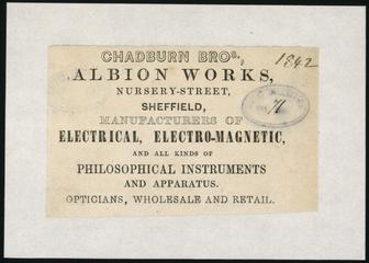 Traded at Albion Works, 27 Nursey St. (1837), Shilo Wheel, 44 Stanley St. (1841), 26 Nursey St. (1841-84), Albion Works, Nursey St. (1847-76), all Sheffield, England & 71 Lord St., Liverpool, England (1851-7). Succeeded by Chadburn's (Ship) Telegraph Co. Limited (1898-1945/6?)